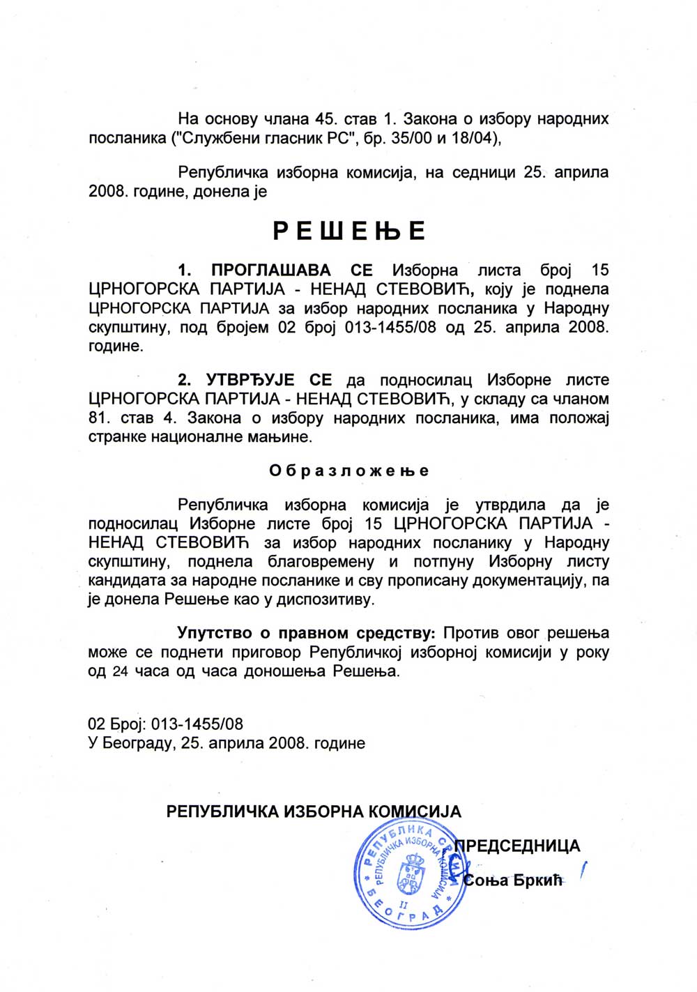 CP predala izbornu listu za parlamentarne izbore u Srbiji- 20.04.2012. |
